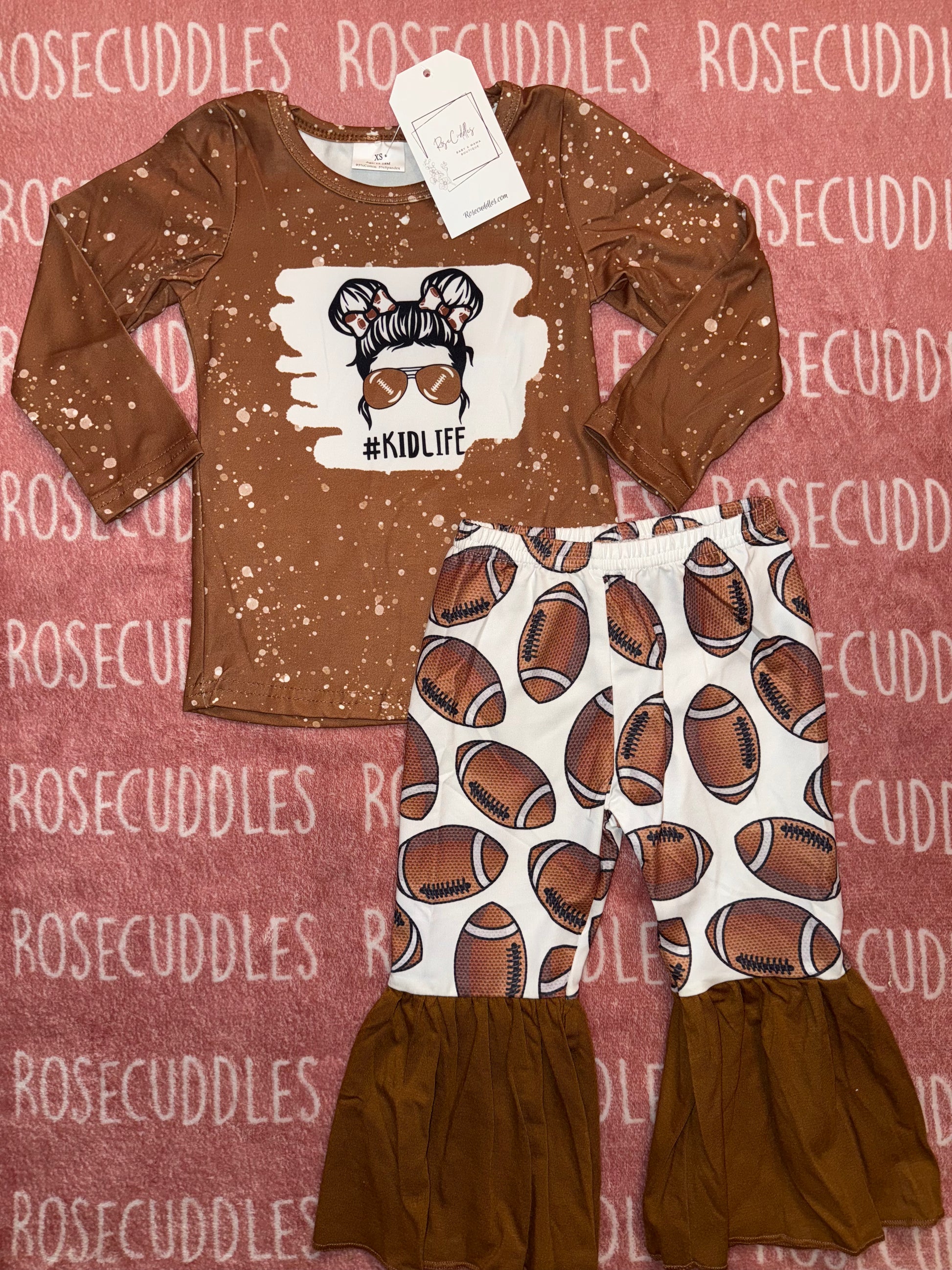 Football Bellbottoms Score big in style with these retro-inspired bellbottoms featuring a bold football theme. Crafted from a premium blend of 95% cotton and 5% spandex, this outfit delivers exceptional comfort with just the right amount of stretch for all-day wear. The classic wide-leg silhouette pairs perfectly with the spirited football graphics, making it an ideal choice for game day celebrations, casual outings, or anyone who appreciates vintage athletic fashion. The breathable cotton construction keeps you cool while the spandex ensures a flattering fit that moves with you.