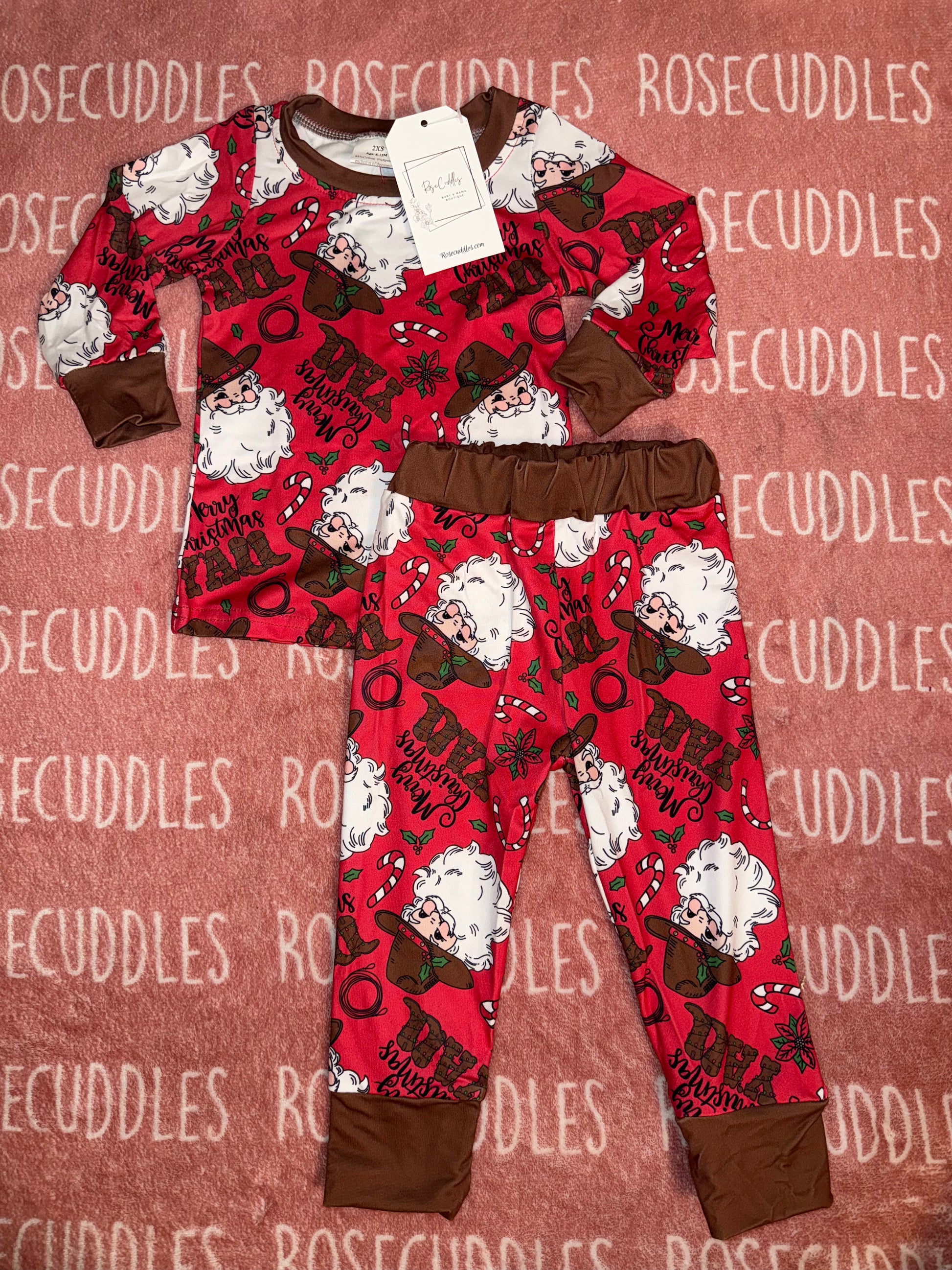 Experience holiday comfort with the Merry Christmas Yall Set, crafted from a soft blend of 95% cotton and 5% spandex for a flexible, breathable fit. Featuring a charming western Santa theme, this pajama set combines festive style with everyday wearability. Ideal for cozy winter nights or festive lounging, it offers durability and ease of movement without sacrificing comfort. Perfect for celebrating the season with a subtle western flair.