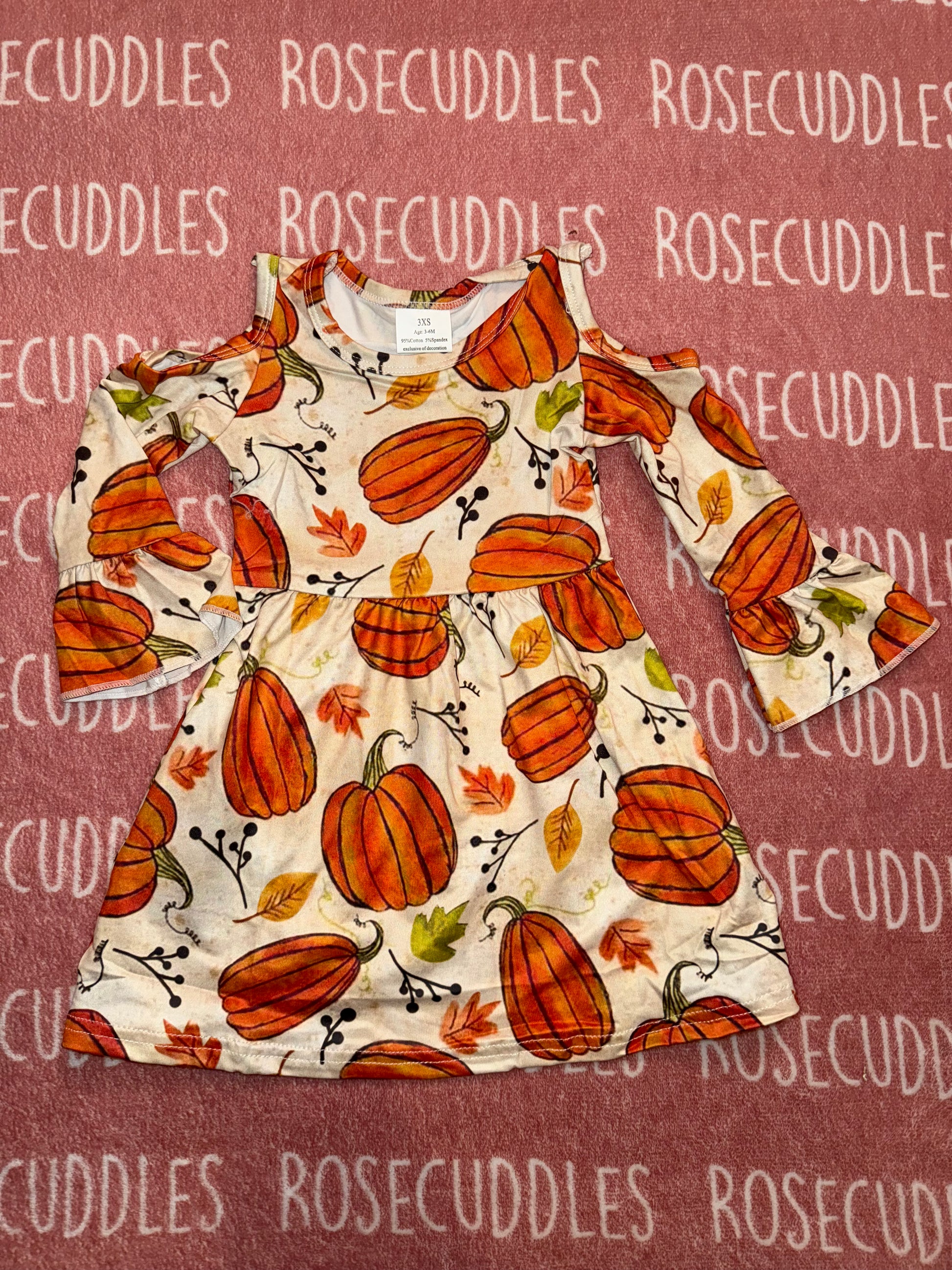 Crafted from a comfortable blend of 95% cotton and 5% spandex, this Pumpkin Dress offers both softness and a gentle stretch for a perfect fit. Designed with an open shoulder style, it adds a stylish, modern touch while keeping your little one comfortable. The charming fall pumpkin theme makes it an ideal choice for seasonal occasions or everyday wear during autumn.